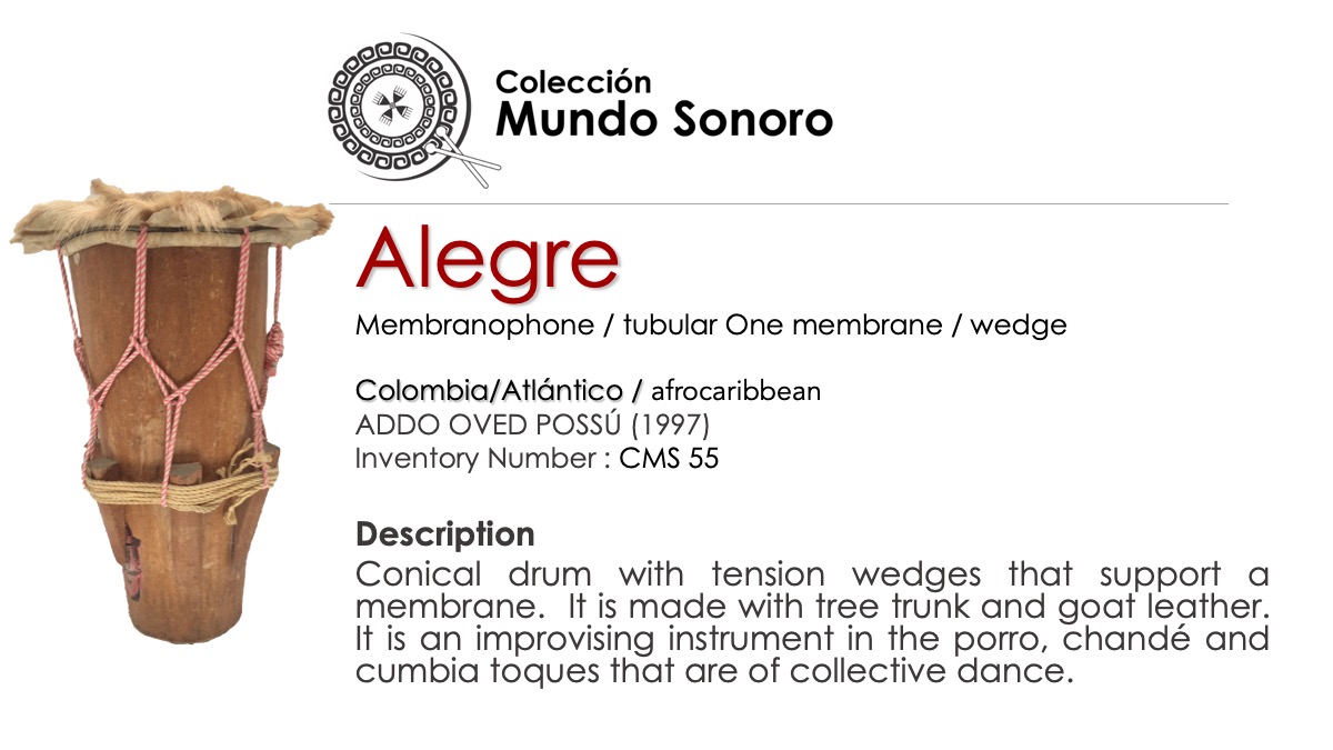 Instrumentos: Alegre / Caña de millo / Maracón/ Llamador / Gaita Hembra / Gaita Macho / Gaita machiembrá / Gallitos /Cununo / Alegre / Marimba de Chonta /Guasá / Jaw-bone.
